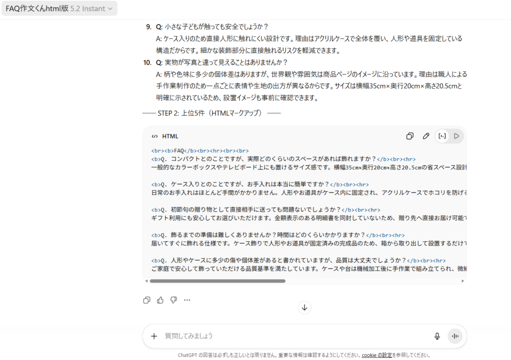 商品情報を読み取りFAQ(よくあるご質問)の文章とHTMLを生成するカスタムGPTsです。